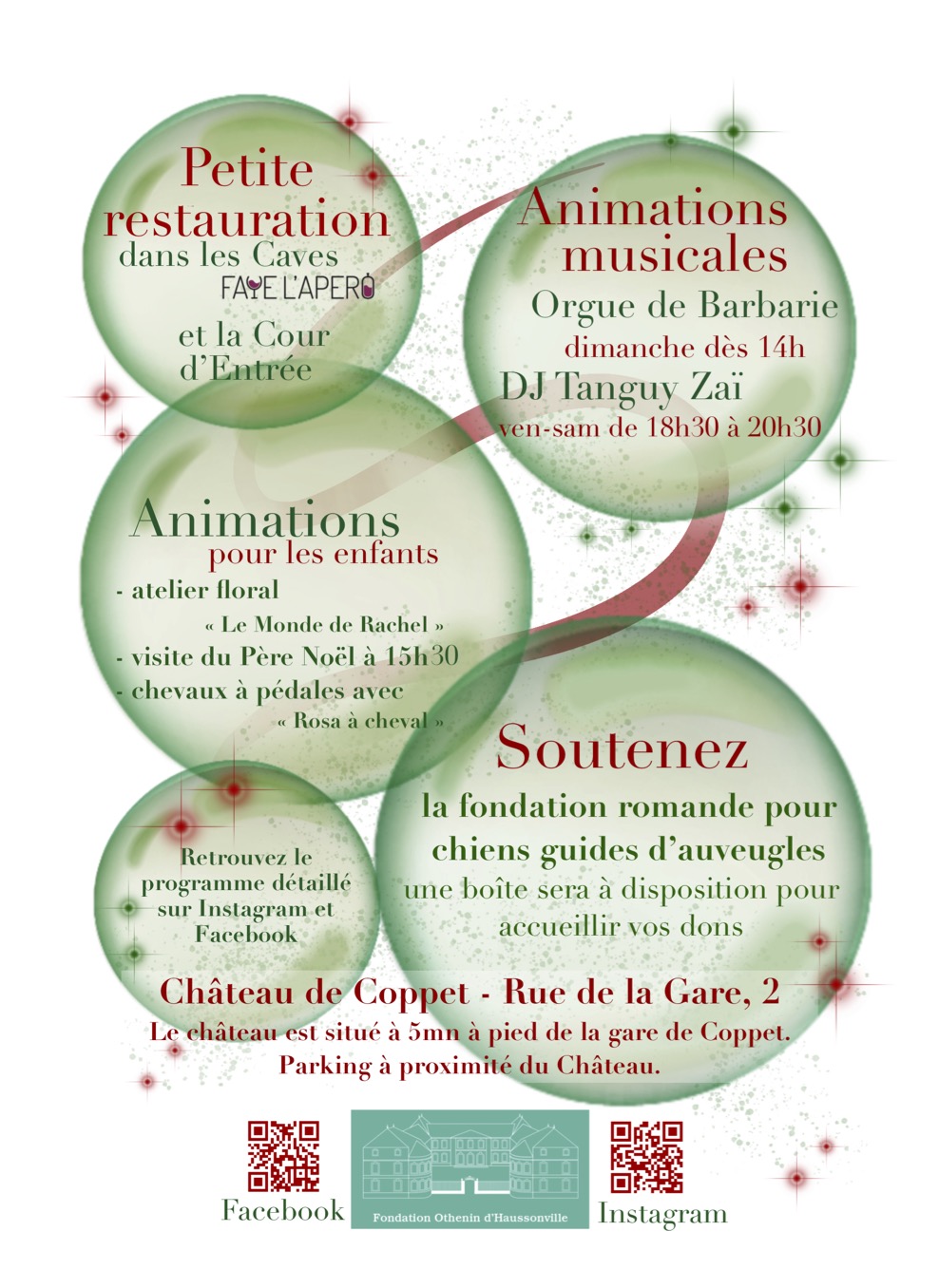 Le Marché de Noël du Château de Coppet se déroule du vendredi 5 décembre au dimanche 7 décembre 2025. L’entrée est gratuite. Cette manifestation réunit plus de 70 exposants proposant de multiples idées de cadeaux sortant de l’ordinaire: décorations de Noël, produits du terroir, boutiques gourmandes … Des animations sont prévues ainsi que des stands de restaurations variés.